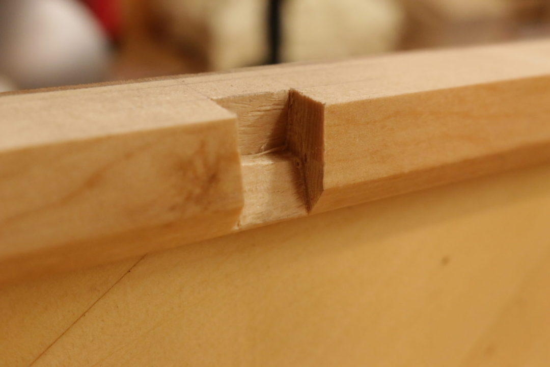 The finished result looks good. It takes a fastener without forcing the joint out of alignment. It can take compressive loads in two different directions, and with a fastener, can take a tensile load too. The downward load is shared by both the haunch and the sloped shoulder preventing the deck beam from splitting at the haunch. Because the notch for this joint is full depth, the deck beam resits twisting or rolling. While it’s tensile capabilities are not what a dovetail might provide, in larger boats, bronze or steel rod collar ties are usually worked into the deck structures provide that. Carlin joints also allow the least possible compromise to the strength of both components and to top it off, allows water to drain out of it too.